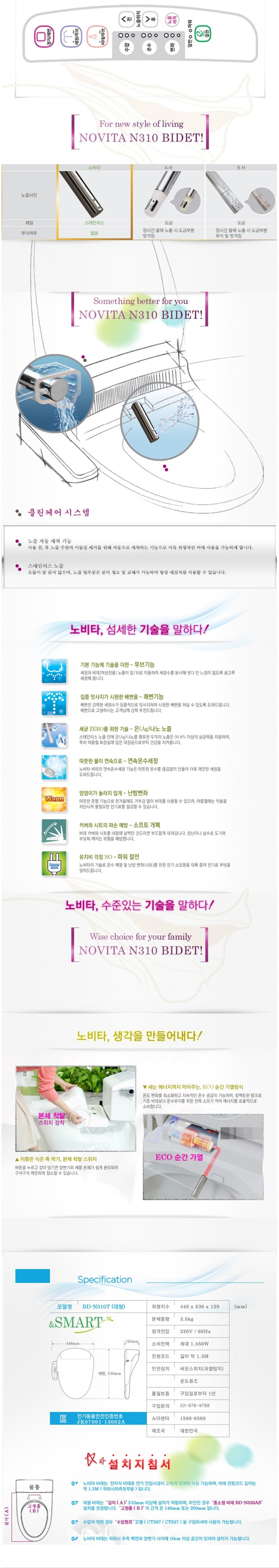 국내 최초 비데를 선보인 Novita의 BD-N310T로 가족의 위생과 청결을 지켜주세요. 이물질 제거를 위해 노즐 사용 전, 후 자동 세척 기능이 작동 되어 위생적인 노즐을 사용할 수 있습니다. 비데의 노즐은 변색 및 오염에 강하고 견고한 스테인리스 재질을 사용 하였습니다. 공기펌프로 풍부한 공기를 세정수에 혼입시켜 부드러운 사용감을 제공 합니다.