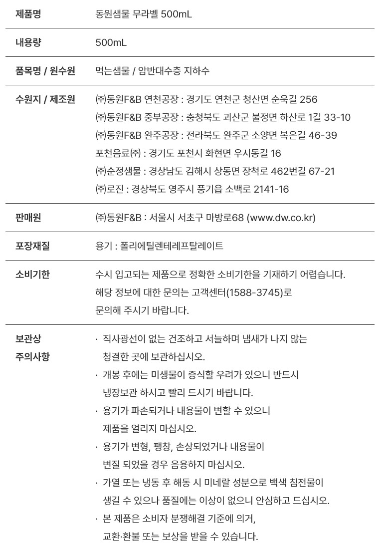 DW 동원샘물 무라벨 생수 500mL x 20병