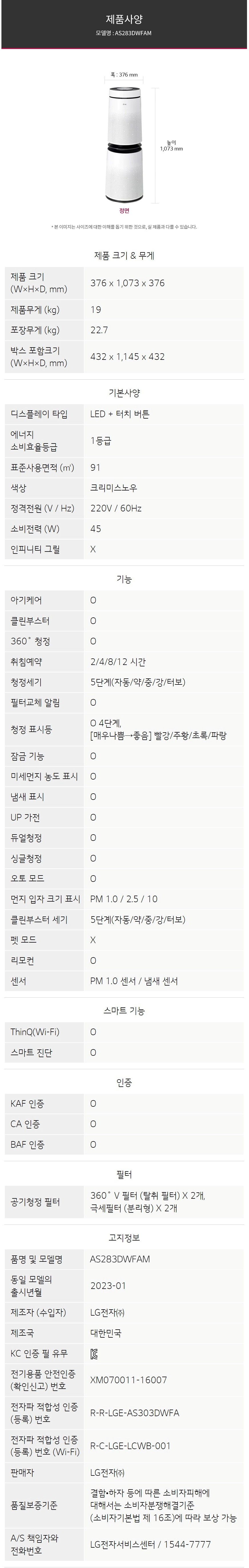 엘지 퓨리케어 360 공기청정기(91㎡) AS283DWFAM