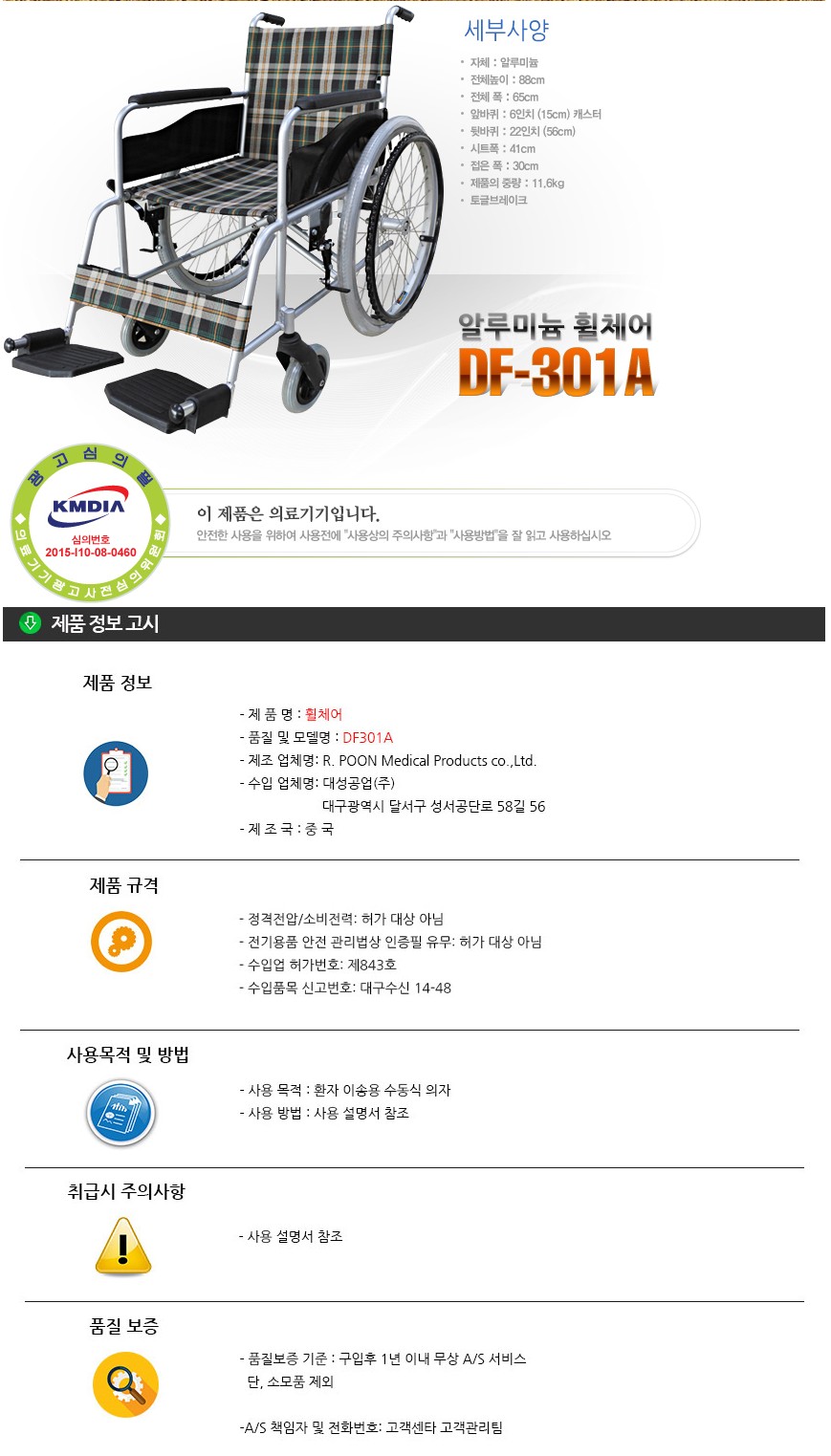 대성 DF-301A 알루미늄 초경량 표준 휠체어