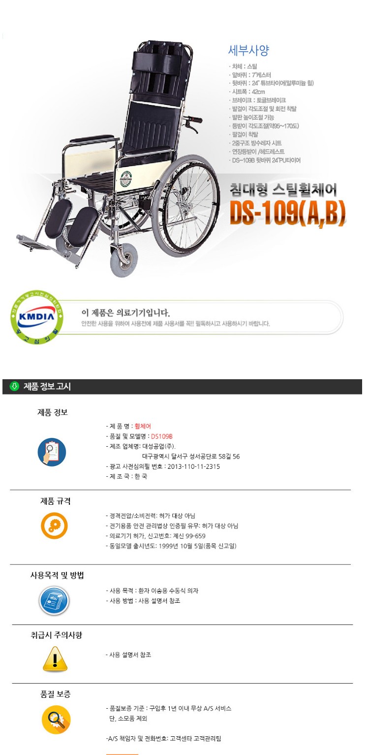 대성 DS-109B(PU) 스틸 침대형 일반 병원용 국산 휠체어