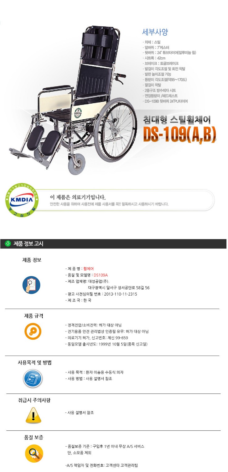 대성 DS-109A 스틸 침대형 국산 휠체어