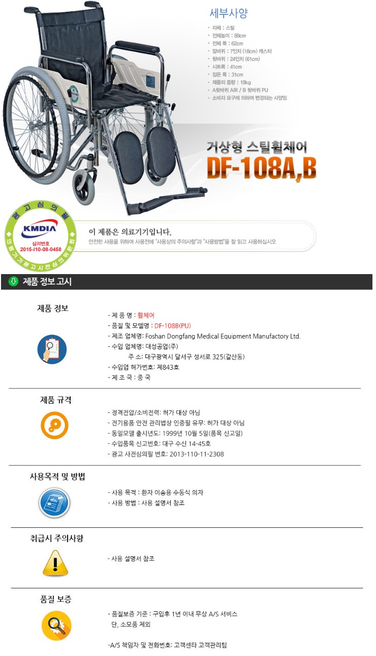 대성 DF-108B(PU) 거상형 일반 병원용 스틸 휠체어