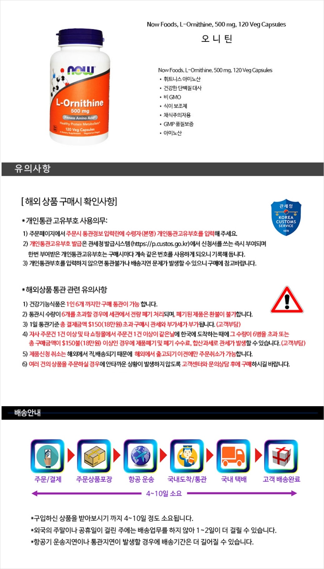 Now Foods 오니틴 L-Ornithine 500 mg 120 Veg Cap