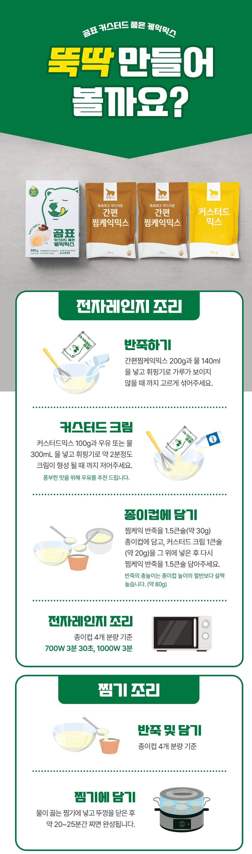곰표 커스터드 품은 케익믹스는 촉촉한 찜케익 속 달콤한 커스터드 크림을 담아내어 온가족이 즐길 수 있는 부드럽고 촉촉한 간식입니다.