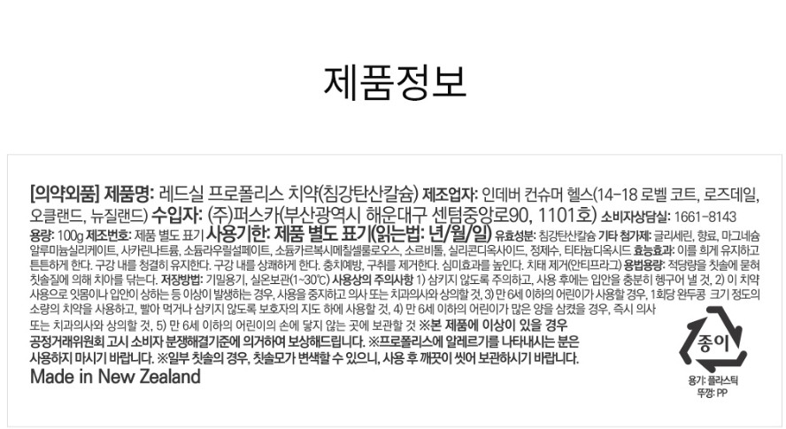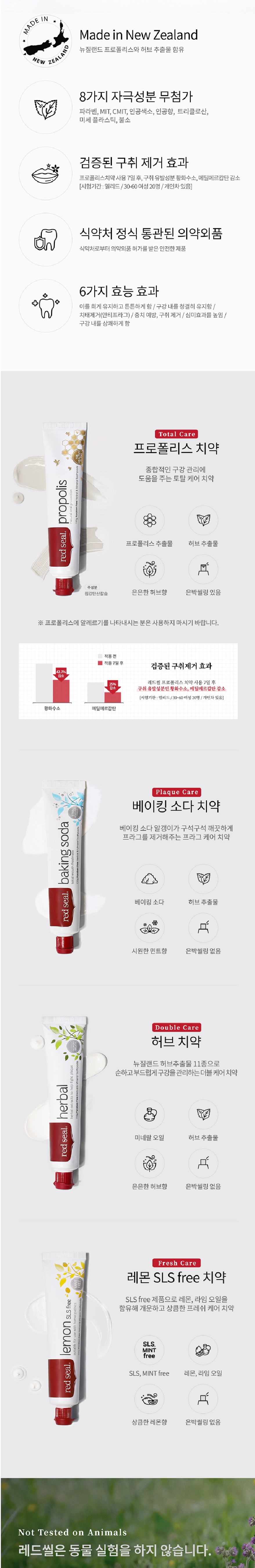 - 레드씰 프로폴리스 치약은 뉴질랜드 프로폴리스와 허브 추출물을 함유해 구취제거, 충치예방 등 종합적인 구강 관리에도움을 주는 토탈 케어 치약입니다.