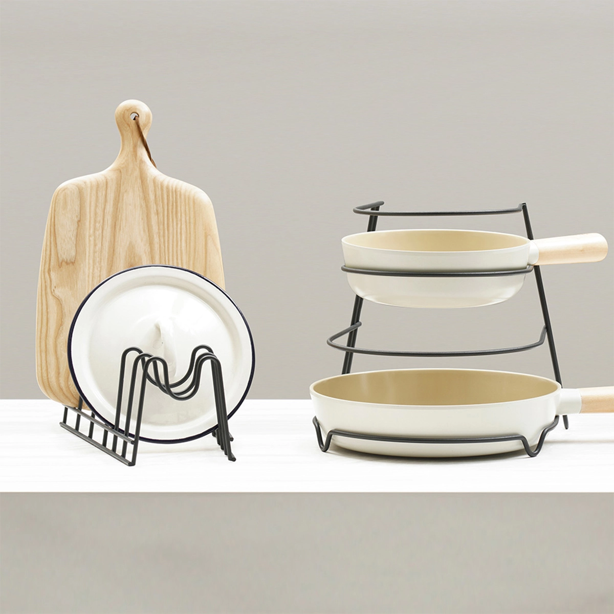 - 사이즈: 프라이팬 정리대 - 25.0 x 27.0 x 23.0cm / 뚜껑 정리대 - 34.0 x 15.0 x 18.0cm